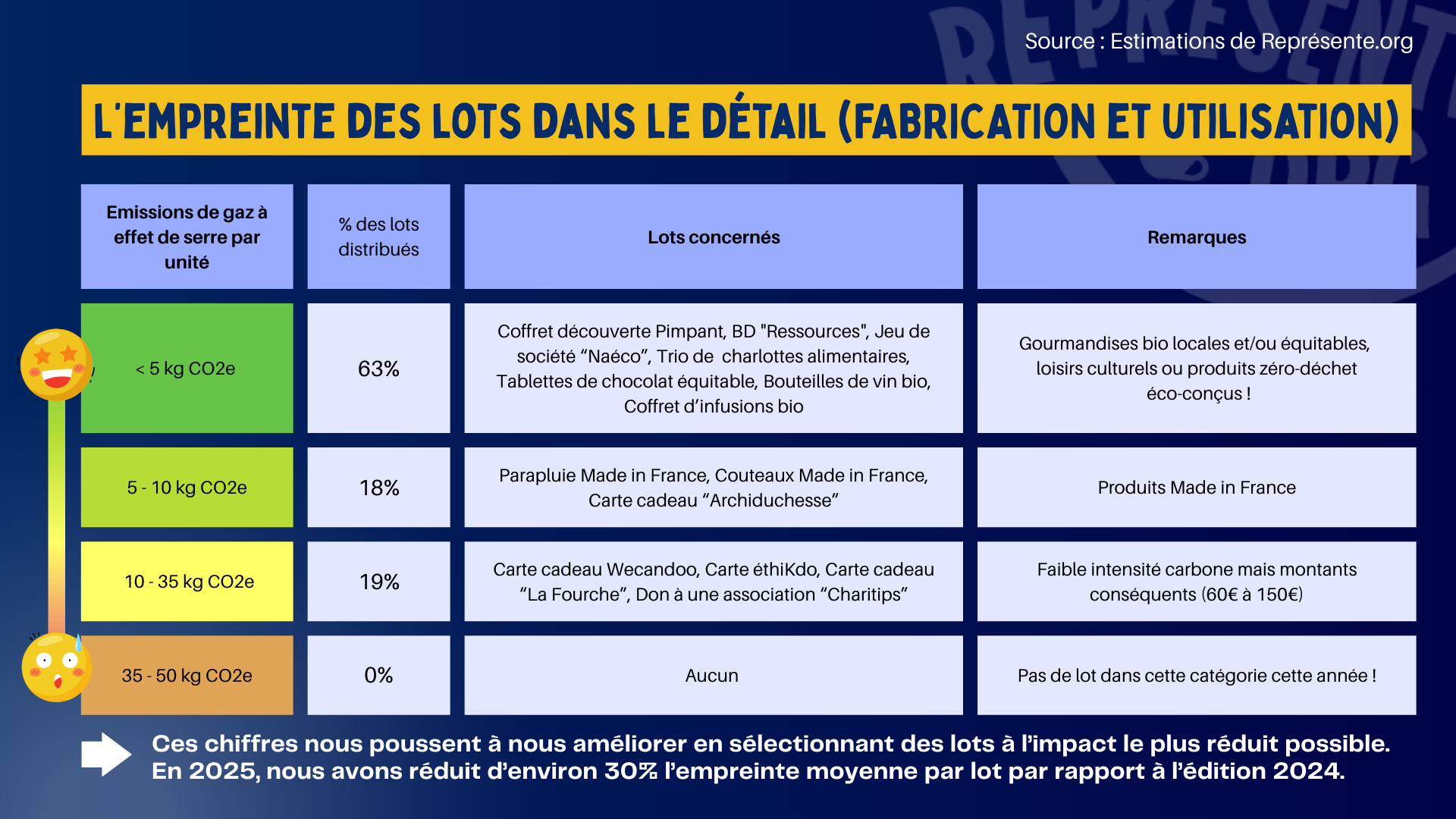 Nous avons réalisé notre Bilan Carbone sur l’ensemble les scopes. L’empreinte carbone de la Tombola en 2025 s’élevait à 15 tonnes de CO2e. Cela correspondait en moyenne à :